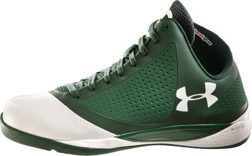 Lightweight, breathable UA HeatGear® prevents sweat build-up to keep your feet cooler and drier—and lighter. Lightweight synthetic patent leather in the forefoot and mid-heel increases support. Asymmetrical collar gives you better range of motion and provides medial ankle support. Internal and external full-length Micro G® foam cushions your landings better than traditional foams AND relaunches you more quickly. Rigid, midfoot TPU shank prevents foot from twisting and rolling from side to side. Molded Micro G® inner liner cushions, rebounds, and keeps your foot from slipping. Full-length, one-piece rubber outsole with multi-directional traction pattern gives you sure-footed lateral and linear movement. Imported. Read more...